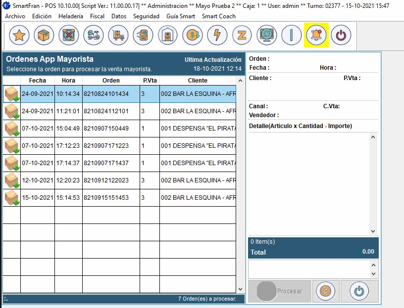 El botón Actualizar Pedidos, le permitirá actualizar el Panel de Ordenes APP Mayorista, de esta manera, aparecerán todos los pedidos pendientes de ingresar al SF-POS.