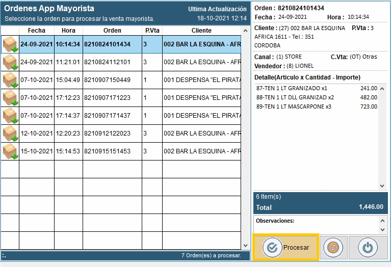 A continuación, se desplegará el Panel de Ordenes APP Mayorista, donde encontrará listadas las órdenes para Procesar y ser facturadas.