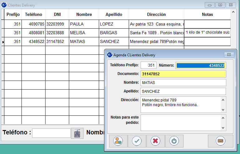Para realizar modificaciones en algún contacto, realice doble clic sobre el mismo y se desplegará la ventana de agenda delivery para aplicar la modificación o cargar nuevos clientes.