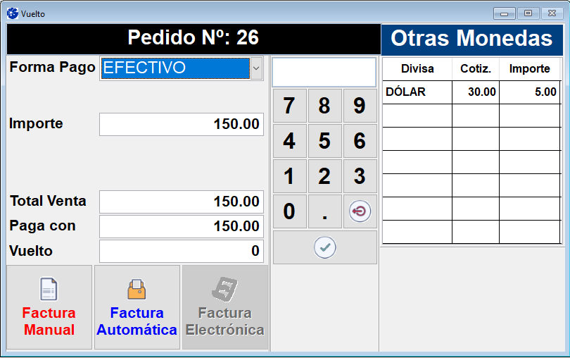 Si está configurado dentro del panel Configuración de Parámetros del POS como "SI", al completar el pedido en la ventana de “Vuelto” observará que se agrega otra columna donde figura el valor de la cotización de la divisa y el precio en dicha moneda.