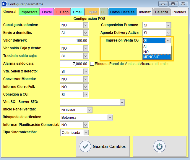 Seleccione “SI” para que se active la Agenda Delivery cuando seleccione una Venta con Envío a Domicilio o Venta Delivery. De esta manera, podrá completar los datos del cliente y tomar su pedido, para luego imprimirlo.