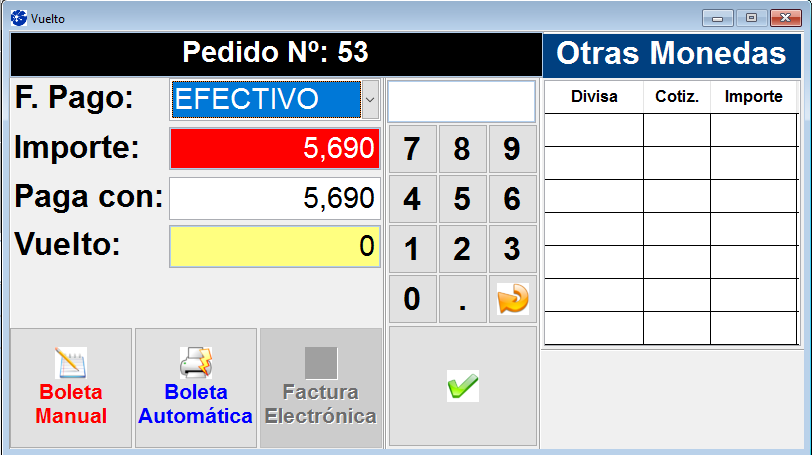 Si está configurado dentro del panel Configuración de Parámetros del POS como "SI", al completar el pedido en la ventana de “Vuelto” observará que se agrega otra columna donde figura el valor de la cotización de la divisa y el precio en dicha moneda.