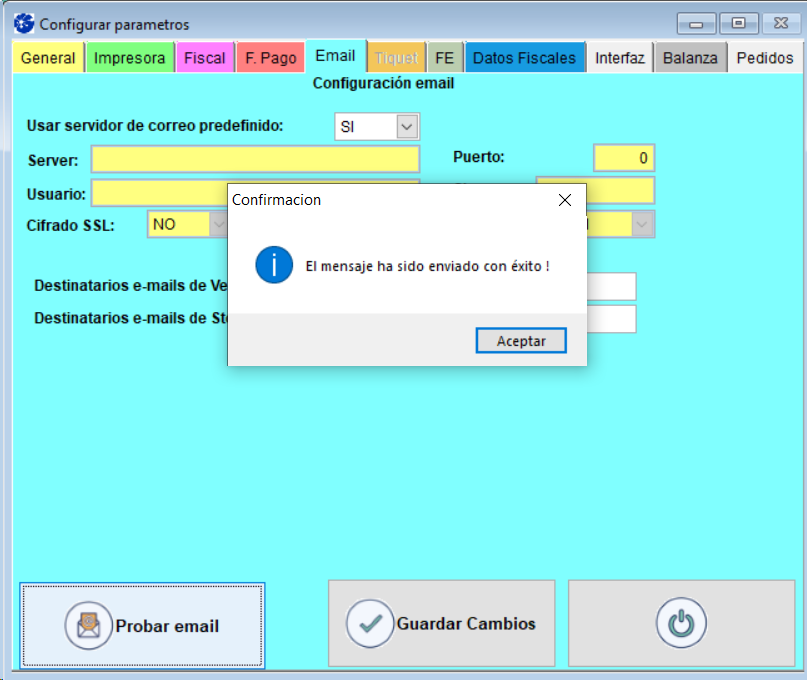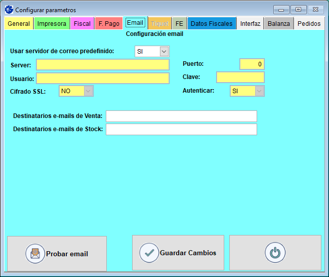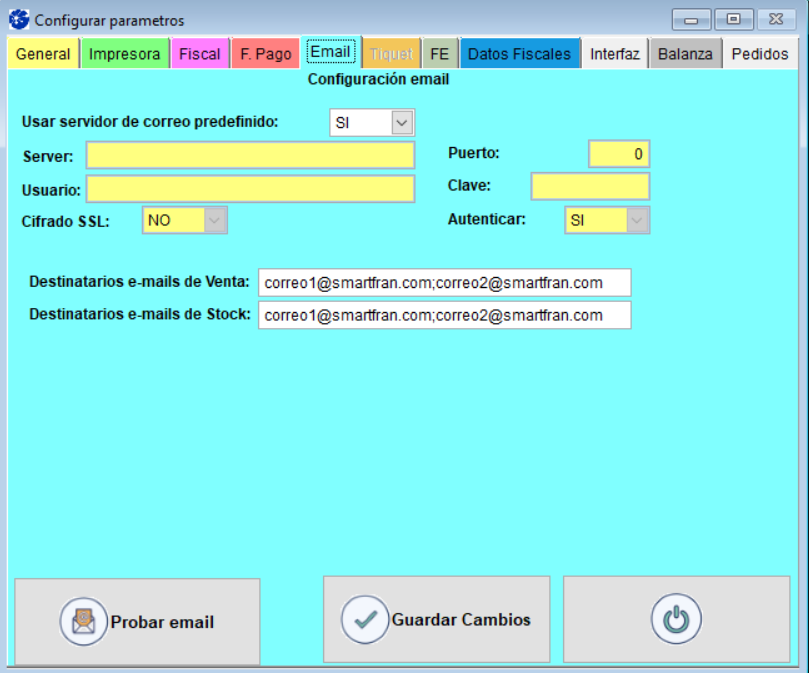 Deberá ingresar la dirección de correo electrónico en los campos “Destinatarios e-mails de Venta” y “Destinatario e-mails de Stock”. Cada vez que realice un Cierre de Turno o envíe un Informe de Stock esta información se enviará a las direcciones aquí configuradas.