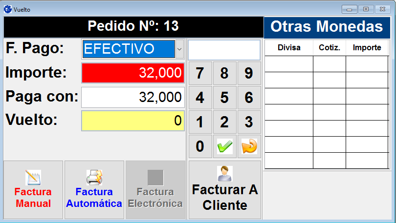 Si está configurado dentro del panel Configuración de Parámetros del POS como "SI", al completar el pedido en la ventana de “Vuelto” observará que se agrega otra columna donde figura el valor de la cotización de la divisa y el precio en dicha moneda.