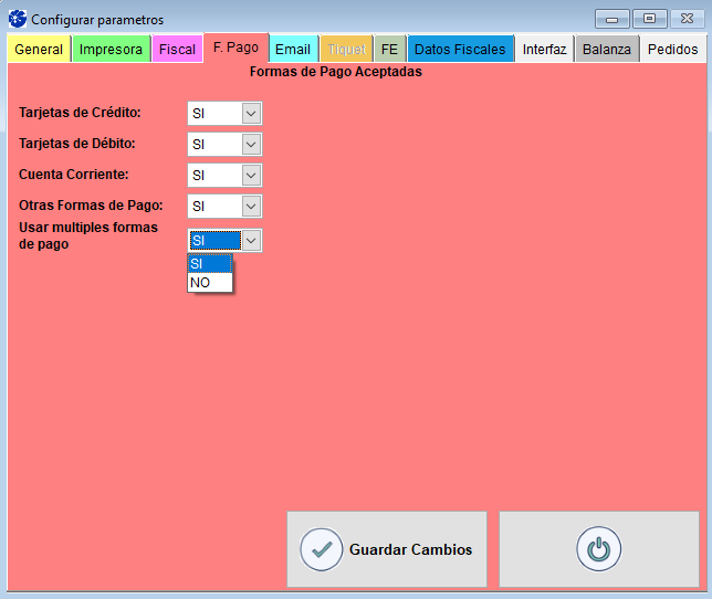 En la solapa “F. Pago – Formas de Pago Aceptadas” configure aquellas formas de pago que va a utilizar en su Franquicia.