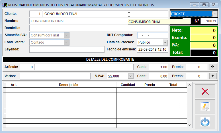 Se despliega la ventana donde se deben completar todos los campos con la información pertinente. Desde aquí puede realizar los 4 tipos de comprobantes si opera con Facturación Electrónica.