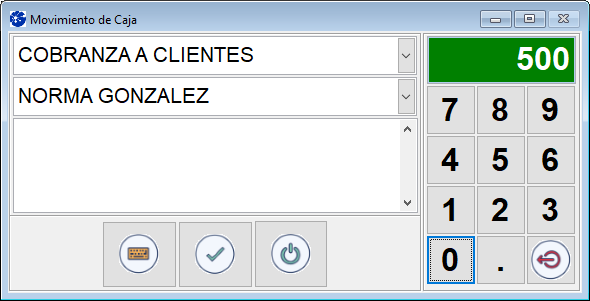 Al ingresar se observa la siguiente pantalla, seleccione en tipo de movimiento: "Cobranza a clientes" y debajo indique el nombre del cliente con el que realizó la operación. Tiene la opción de redactar un comentario sobre la operación realizada. Para finalizar coloque el importe y haga clic en el tilde verde para confirmar.