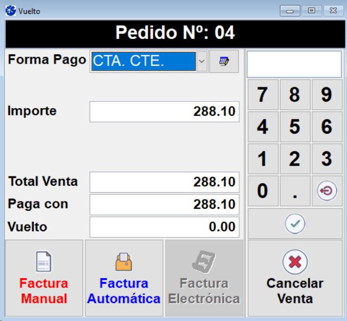 Una vez confeccionado el pedido seleccione “Cerrar Venta”, se abrirá la pantalla para efectuar el pago. El mismo se puede realizar en efectivo, cuenta corriente, tarjeta de crédito/débito u otras formas de pago, según la configuración establecida.