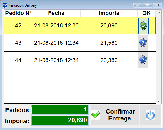 Para rendir el pedido haga clic sobre el ícono del escudo con el signo de interrogación y se seleccionará el Delivery a rendir. Debajo observará los pedidos señalados y el importe total de los mismos, como se muestra a continuación:
