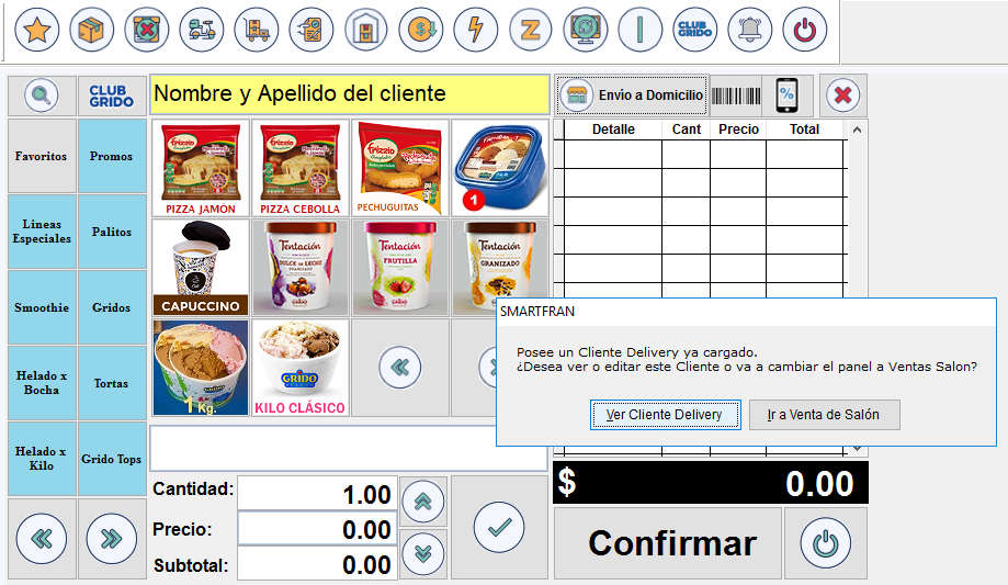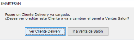 Para agregar notas al pedido o modificar los datos configurados de un cliente, en el panel de ventas, si ya se encuentra posicionado en el cliente, realice clic nuevamente sobre “envío a domicilio”, se despliega un mensaje que consulta si lo que intenta realizar es "Ver el Cliente Delivery" o desea cambiar al modo “Venta Salón”, en este caso seleccionamos "Ver Cliente Delivery".