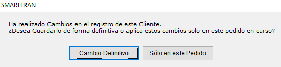 El sistema le preguntará si los cambios realizados desea aplicarlos al pedido que está gestionando o son cambios definitivos sobre el cliente agendado. Realice clic en el botón que corresponda.