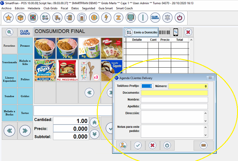 Si el cliente ingresado corresponde a un socio Club Grido, automáticamente se identificará al socio por medio del Número de Identificación y lo loguea para sumar puntos por la compra realizada en caso que corresponda.