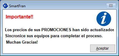 Si aparece un mensaje indicando que “no es posible actualizar las promociones en este momento”, deberás comunicarte con el Centro de Atención de SmartFran para revisar el inconveniente.