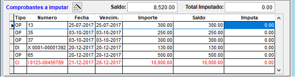 Una vez que complete estos datos haga clic en el ícono “+” para confirmar; al realizar esto se listan debajo todos los comprobantes pendientes de imputar de la cuenta corriente seleccionada.