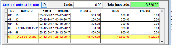 Observe un ejemplo de Comprobantes sin imputar: