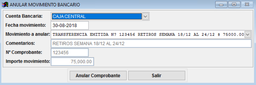 Para acceder a la planilla ingrese desde "Bancos", opción "Anular Movimiento":