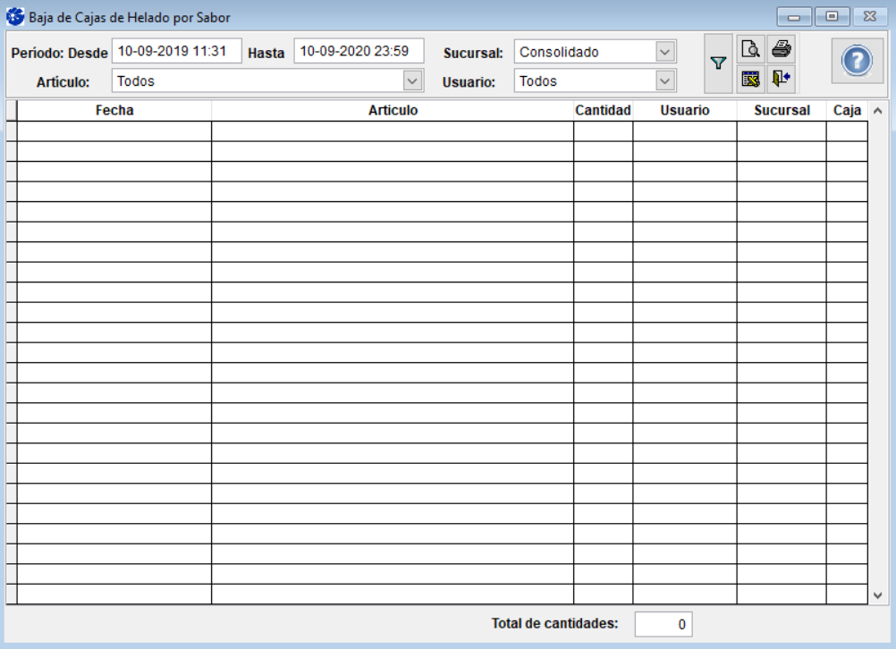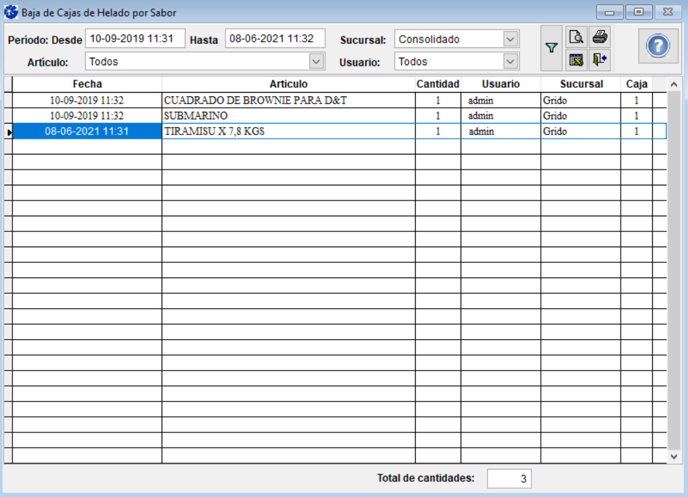 Utilice el Informe para consultar los registros de bajas de cajas de helado por sabor realizados desde SF POS.