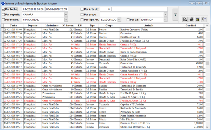 Utilice el informe de Movimientos de Stock por artículo para visualizar los diferentes movimientos de los artículos, en un período determinado, por depósito, tipo de movimiento, grupo, tipo de artículo y si es movimiento de entrada o salida.