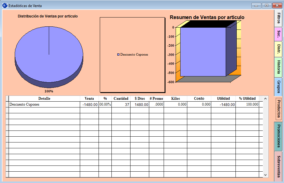 Utilice el Informe Estadística de Ventas en la pestaña Productos para analizar el comportamiento de los cupones Grido Check redimidos en el punto de ventas.