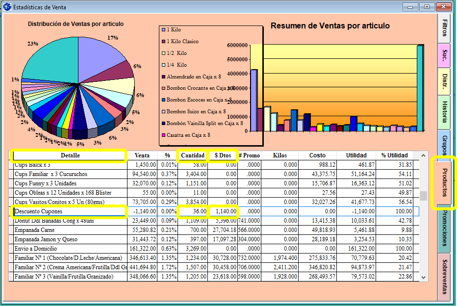En la columna "Venta" indica el monto en dinero realizado como descuento en cupones grido check