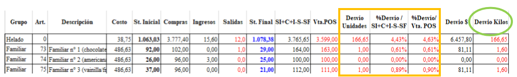 Incorporamos nuevos filtros y mayor información para que el análisis de Desvío de Stock sea más específico y detallado. Podrá ahora elegir el Rubro Comercial, por ejemplo Cremas Heladas o Congelados. Encontrará además los desvíos expresados en Unidades y Kilogramos, no solo en Helado a granel, sino también en Impulsivos y Congelados.