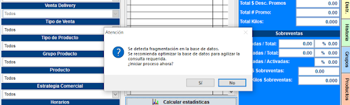 Cuando se ingresa al Informe de Estadísticas de Ventas aparece la notificación de optimización de Base de Datos. Seleccioná “Si” para iniciar el proceso y agilizar las consulta